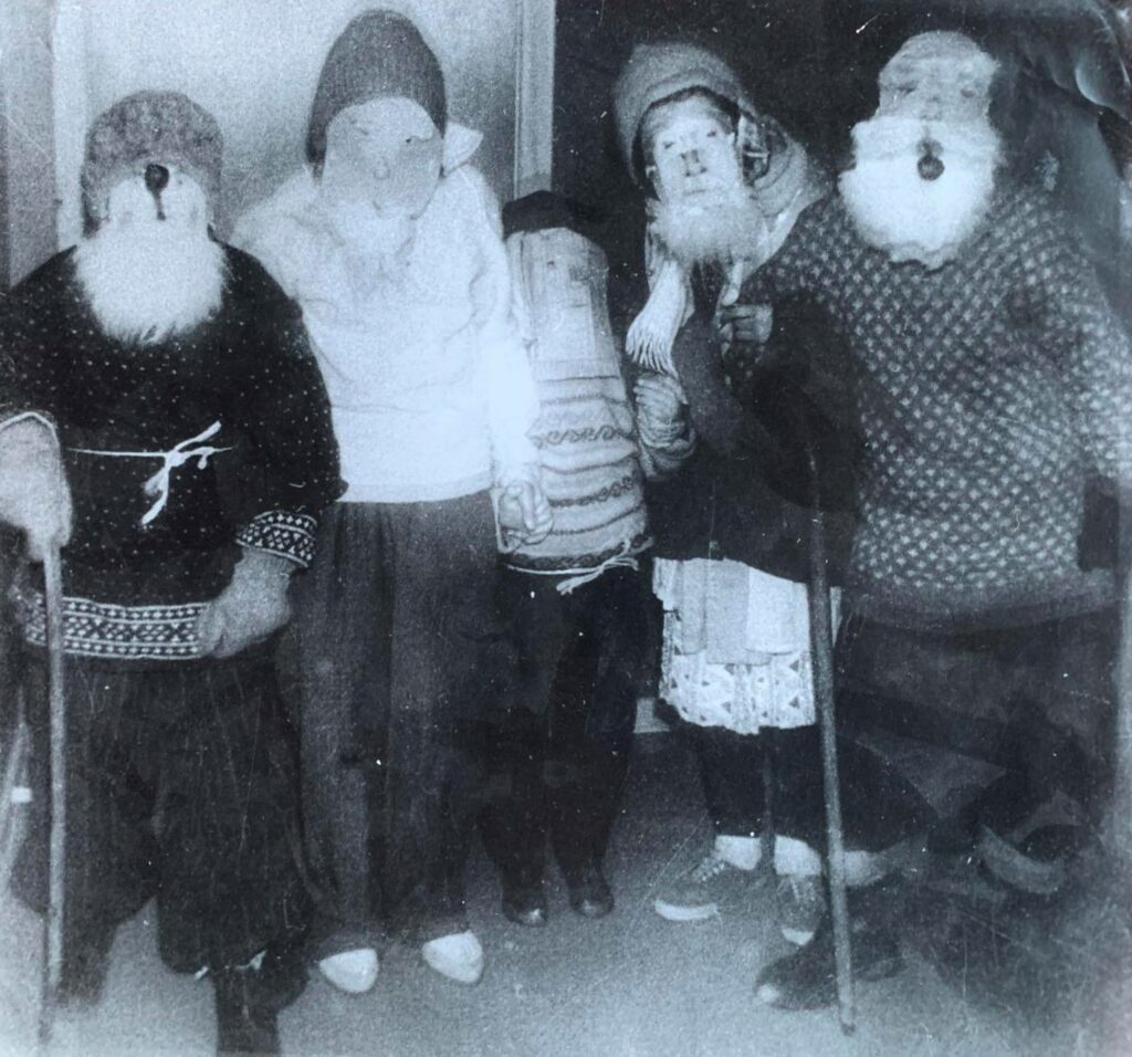 Vit gentur møttust vanliga heima hjá okkum. Mamma mundi eiga nakað nógv av gomlum klæðum, so har lá væl fyri. Hon garvaði eisini seyðaskinn, og har mundi onkur fráskurður vera, tí har vóru skinnlepar, sum kundu brúkast til skegg á gekkaskortinum. Ja, vit kallaðu tað gekkaskort - nú verður hann nokk oftari kallaður grýluskortur.
