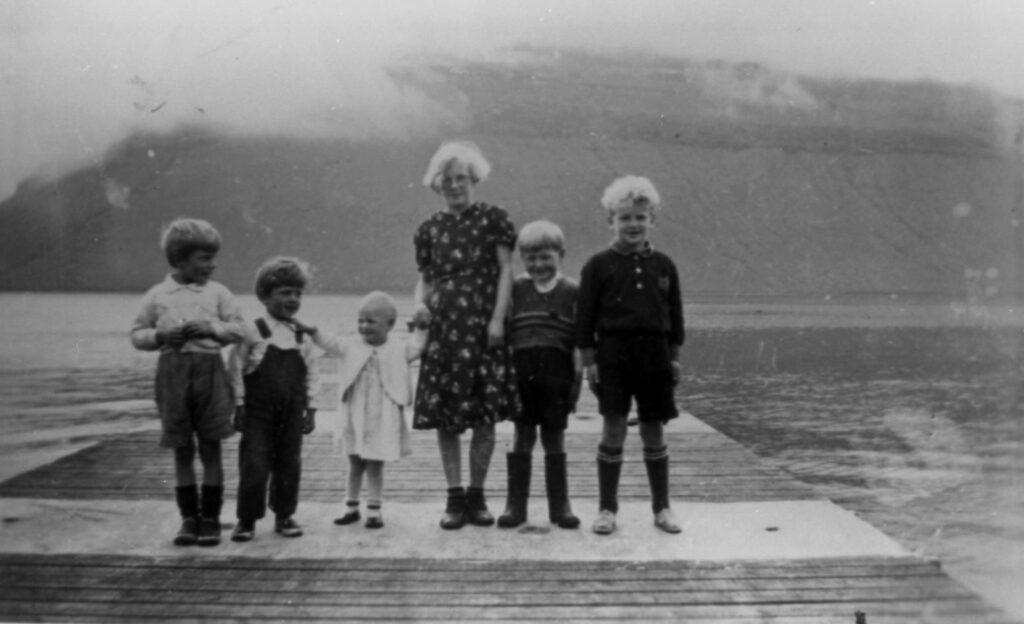 Á myndini niðanfyri, sum er tikin á Sjóvarbrúgv eru f.v. : Andrew1929, Hans Jørgen1931, Emmy1932, Jenny1923, Børge1929 og Otto1925