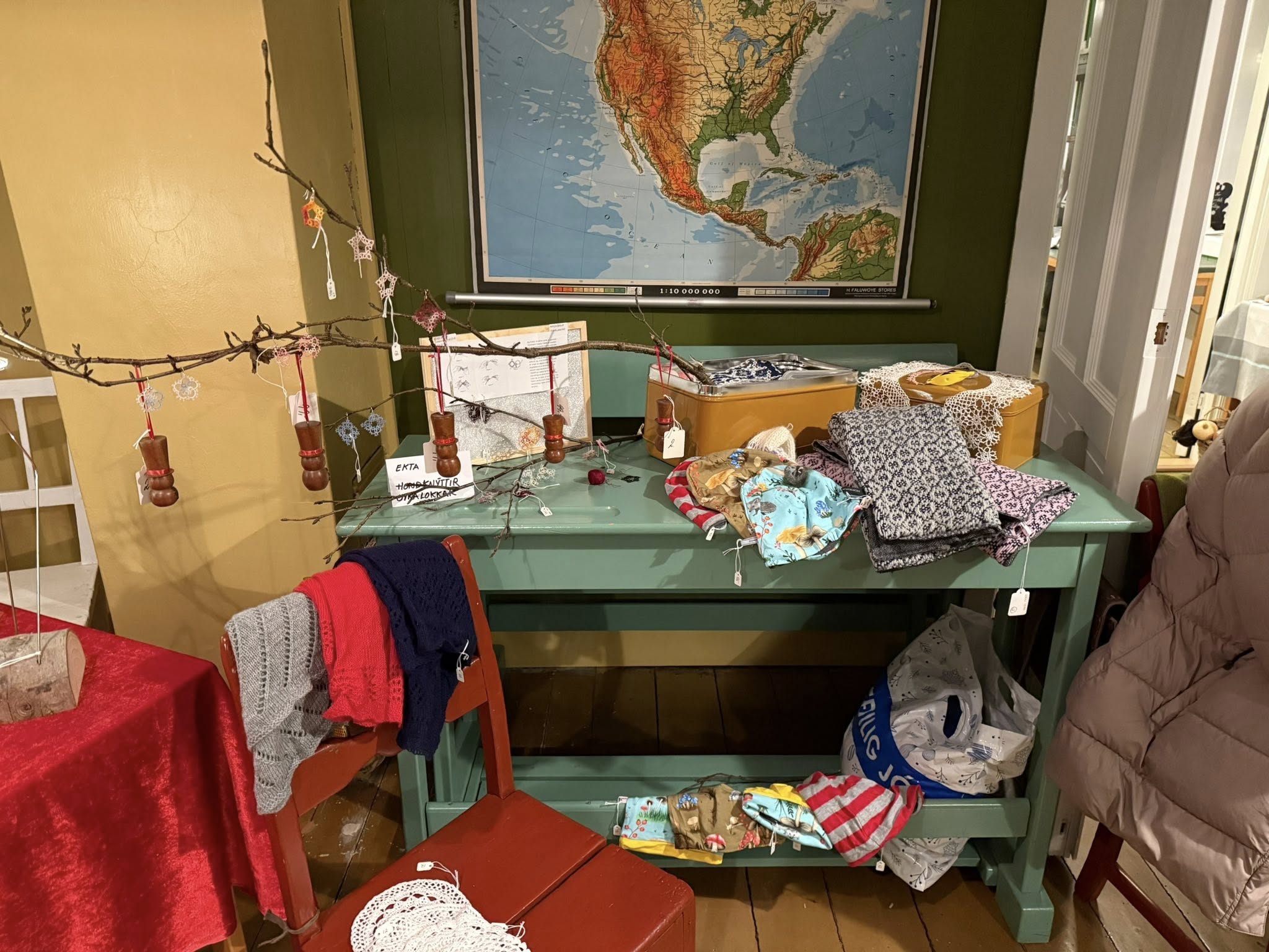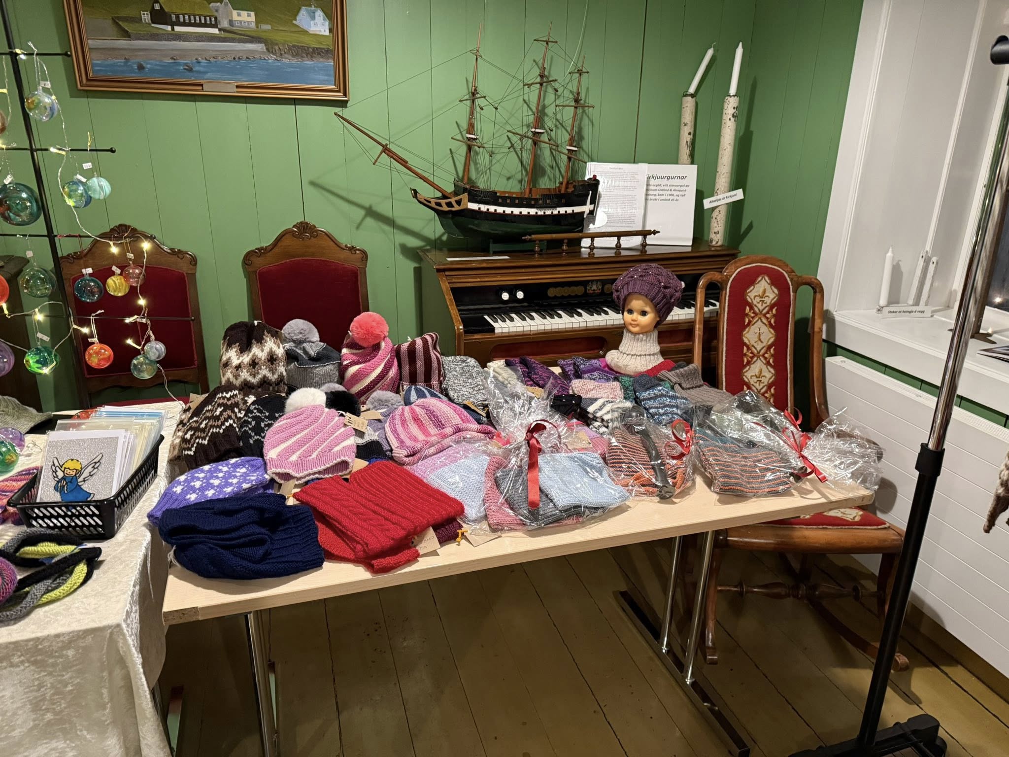 Á loftinum angar so væl av nýbakaðum, tí har er Jólacafe , har eru nýbakaðar vaflur, kaffi, te, kaka og fiskasúpan til keyps.