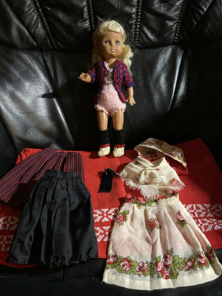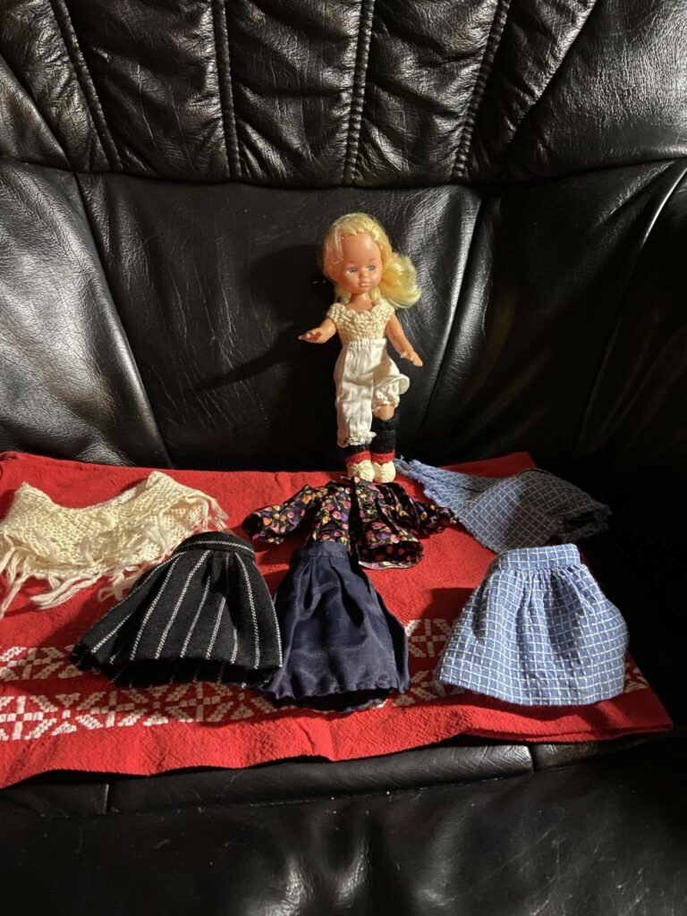 Hinar báðar dukkurnar fekk eg frá Ragnu fastir , hon bant og seymaði øll klæðini sum tær eru í. Eg var so glað fyri hesar dukkur , enn tann dag i dag eri eg glað fyri tær og síggji hvussu stórt handverk talan er um, øll klædini eru so gjøgnumførd, eg hugsi um allar tímarnar hon hevur brúkt uppá tey.