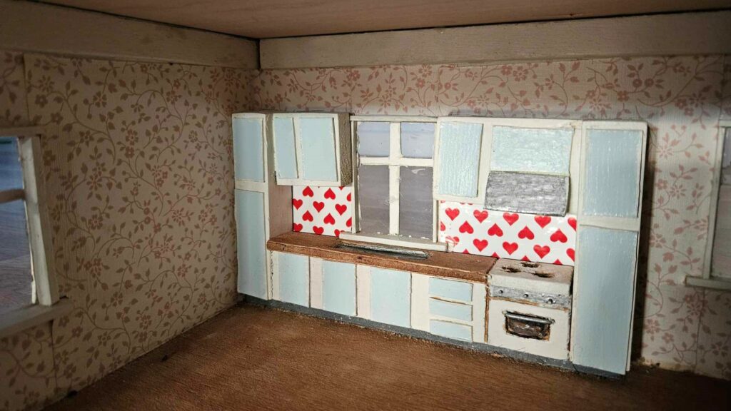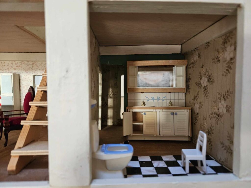 Tá vit bóru eygað við dukkuhúsið, sum Esmar Olsen hevði smíðað,vóru vit báðar seldar. Húsið var so fitt og snøgt bæði innan og uttan, og væl mála og tappisera. Serliga løgdu vit til merkis at køkurin og wc vóru heimagjørd við elementum, sum myndirnar vísa.
